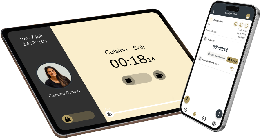 Elle permet aux employés de badger leur entrée et leur sortie avec l'application mobile ou notre appareil physique Sunkhronos Timeclock.